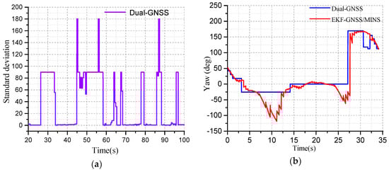 (a) The standard deviation of GNSS heading angle; (b) The yaw angle test of the dual-antenna GNSS is unavailable.