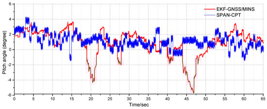 In the driving test, the pitch angle of the two-antenna GNSS/MINS is tested. Compared with the SPAN-CPT system, the dual-GNSS/MINS combination has better accuracy and dynamics than the MINS and dual-antenna GNSS in the driving vehicle test, as shown in Figure 15.