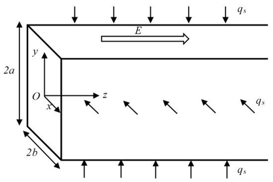 As sketched in Figure 1, a rectangular microchannel of width 2b and height 2a is considered. The channel is filled with power-law nanofluid with a dielectric constant ε and is subject to constant heat flux qs. The channel wall is uniformly charged with zeta potential ξ, and the electric double layers (EDLs) will not overlap. As an electric field is applied tangentially along the channel (z-direction), the liquid inside is set in motion due to the existence of free ions in EDLs. Owing to the symmetry, the following analysis is limited to a quarter of the channel, , and the coordinate system used is shown in Figure 1.