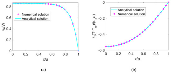 The comparison between the numerical solution and analytical solution from for (a) velocity distribution at and (b) temperature distribution at .