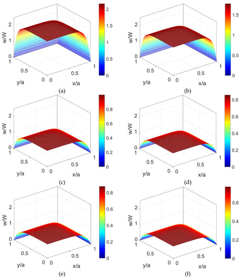 Figure 3 illustrates velocity distributions of shear thickening nanofluid, Newtonian nanofluid, and shear thinning nanofluid at different volume fractions when K = 10. Figure 3a,c,e show the velocity distributions of shear thinning fluid, Newtonian fluid, and shear thickening fluid without consideration of nanoparticles in fluid, namely at ϕ = 0. Figure 3b,d,f show the velocity distributions of shear thinning nanofluid, Newtonian nanofluid, and shear thickening nanofluid at ϕ = 0.06. It is noted from these two groups of figures that the velocity shows homogeneous abatement across the channel as the volume fraction of nanoparticles increases no matter what fluid rheology is considered. This is because the nanoparticles in fluid enhance the effective viscosity of power-law nanofluid in response to the sear rate and cause greater dispersion of the velocity distribution. As observed in [7], although considering the EOF of power-law nanofluid, the shear thinning feature of base fluid leads to greater velocity compared to the shear thickening feature of the base fluid.