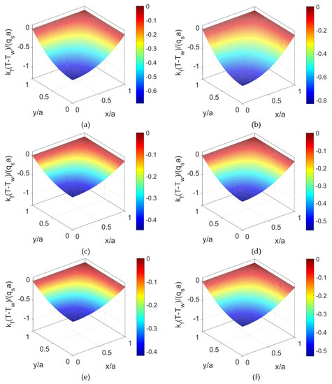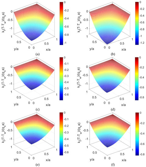 with and [32,42]. T denotes temperature field, ω implies the ratio of the nanolayer thickness to the original particle radius. σ, k, and (ρcp) denote electrical conductivity, thermal conductivity, and heat capacity of power-law nanofluid at the reference pressure, respectively. The subscripts s, f, and eff denote the solid nanoparticles, base fluid, and nanofluid, respectively. The second term at the right-hand side of Equation (13) denotes the volumetric heat generation owing to the Joule heating effect. The corresponding boundary conditions are