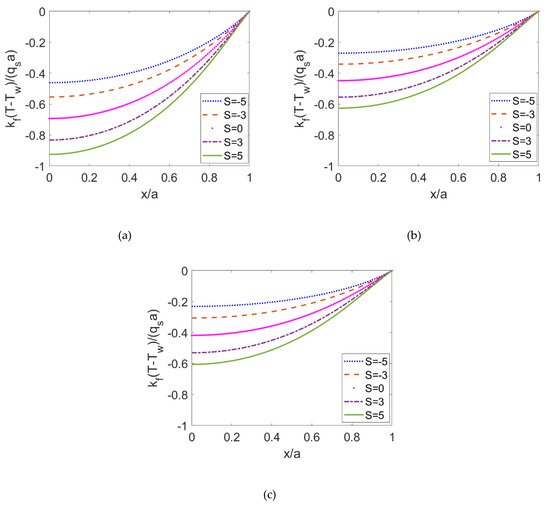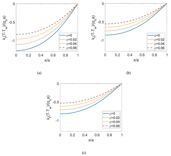 To observe the influence of the Joule heating parameter on the temperature, in Figure 7, the temperature profiles at for different Joule heating parameters S are illustrated in the case of shear thinning nanofluid, Newtonian nanofluid, and shear thickening nanofluid when ϕ = 0.06 and K = 10. As seen in Figure 5, no matter what nanofluid is considered, as the Joule heating parameter increases the variation of temperature increases, namely, the temperature difference between the centerline and the channel wall enlarges. It implies that although the energy from Joule heating effect is uniformly enhanced, the heat transferred through convection near the channel wall is much less than near the centerline. And this effect is more notable when considering shear thinning base fluid.