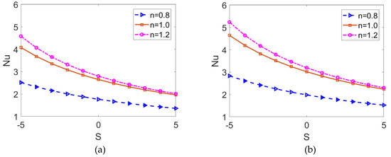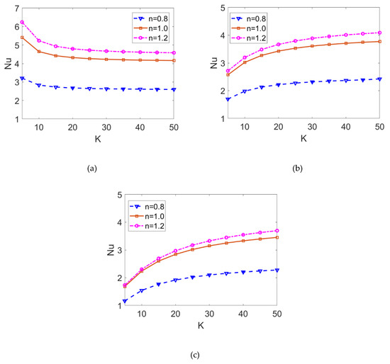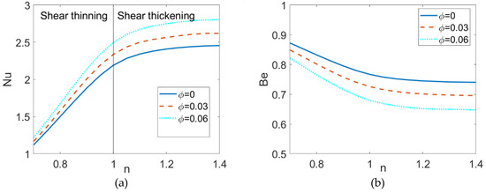 The variation of the Nusselt number Nu and the variation of Bejan number Be with flow behavior index n for different volume fractions of nanoparticles are depicted in Figure 10 when K = 20 and S = 3. The combined effects of nonlinear rheological behavior and nanoparticle volume fraction on Nusselt number are investigated. To note, the dependence of Nusselt number on the flow behavior index shows nonlinear. For shear thinning base fluid, the Nusselt number is more amenable to the change in flow behavior index n. The increase in viscosity for shear thinning fluid resulting from the decrease in flow behavior index reduces the Nusselt number, and thus, the heat transfer rate of shear thinning nanofluid is obviously less than that of shear thickening nanofluid. Furthermore, the variation of the Nusselt number with the volume fraction of nanoparticles is almost linear. It shows that the heat transfer performance of nanofluid is clearly enhanced compared to the conventional fluid regardless of the base fluid rheology. These results are also witnessed in Figure 10b. The increase in nanoparticle volume fraction and flow behavior index leads to the enhancement of heat transfer, which further reduces the “loss” of useful energy, i.e., the total irreversibility of the system. Moreover, the Be > 0.5 implies that the primary irreversibility is contributed to the heat conduction when S = 3.
