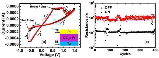 Figure 1. The Current–Voltage (I–V) characteristics in Pt/Pt:SiOx/Ta memristors. (a) The I–V curves for the Set and Reset transitions. A current compliance limit of 0.5 mA is given in the Set process to avoid the breakdown; (b) The ON and OFF resistance states in 400 cycles, extracted at low voltage (0.1 V).
