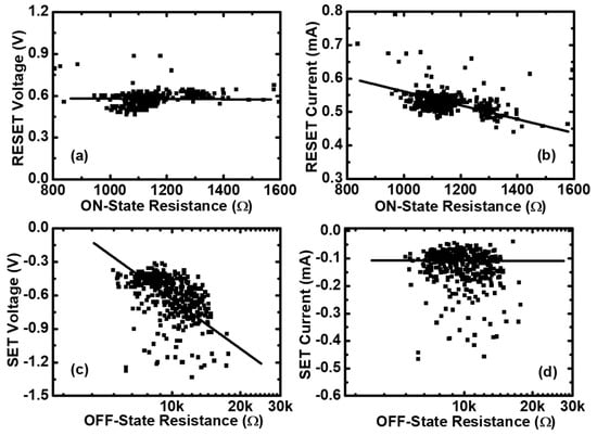 To investigate the variability of RS parameters in both the Set and Reset processes, the statistics of RS parameters versus the initial resistances has been done, and are shown in Figure 2. Figure 2a,b shows the Reset voltage and Reset current ( V R E S E T and I R E S E T ) versus the ON-state resistance ( R O N ), which is calculated at a low voltage (0.1 V). According to the statistics results, we can see that V R E S E T is nearly independent of R O N , whereas I R E S E T is inversely proportional to R O N . This observation is compatible with the thermal-activated dissolution model [38]. In this model, the Reset event happens only when the temperature of the CFs reaches a critical value. Figure 2c,d shows the Set voltage and Set current ( V S E T and I S E T ) versus the OFF-state resistance ( R O F F ), also calculated at 0.1 V. From these two figures, it can be seen that V S E T is proportional to R O F F , whereas I S E T is nearly independent of R O F F . Through the statistics of RS parameters, we can know that the variations of R O N and R O F F have a strong impact on the uniform distributions of RS parameters. We could improve the performance of memristors by controlling the sizes of the CFs before the Reset and Set transitions.