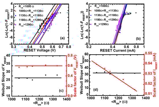 where β is the Weibull slope or shape factor, which represents the statistical dispersion. x 63 % is the scale factor parameter, which is the value of F 63 % . After fitting of the experimental data by the Weibull distribution, we can obtain the Weibull parameters of V R E S E T and I R E S E T , as shown in Figure 3c,d. The scale factor of V R E S E T ( V R E S E T 63 % ) is independent of R O N , and the scale factor of I R E S E T ( I R E S E T 63 % ) is inversely proportional to R O N , which is consistent with the scatter plots of Figure 2a,b. The Weibull slope of V R E S E T and I R E S E T is nearly independent of the ON-state resistances, which means that there are no microstructure variations of the CFs before the Reset point [38,39]. Similarly, the Weibull parameters of V S E T and I S E T can be obtained by fitting the experimental data using the Weibull distribution function, as shown in Figure 4c,d, respectively. The scale factor of V S E T ( V S E T 63 % ) is proportional to R O F F , and the scale factor of I S E T ( I S E T 63 % ) is independent of R O F F , which is consistent with the scatter plots of Figure 2c,d. The Weibull slopes of V S E T and I S E T are nearly independent of the OFF-state resistances, which means that there are no obvious microstructure variations of the CFs before the Set point [40].