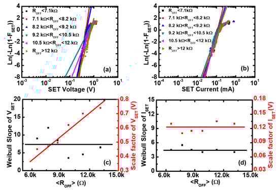 Figure 4. The Weibull distributions of the Set voltage and the Set current in Pt/Pt:SiOx/Ta devices. Experimental distributions (symbols) and the fitting to Weibull distribution (lines) of (a) the Set voltage and (b) the Set current as functions of the OFF-state resistance. Weibull slopes and scale factors of (c) the Set voltage and (d) the Set current versus < R O F F >, where < R O F F > is the average value of the OFF-state resistance ( R O F F ) in each screening range. It can be seen that the Weibull slopes of the Set voltage and the Set current are independent of < R O F F >, and the scale factor of the Set voltage is proportional to < R O F F >, whereas the Set current is constant.