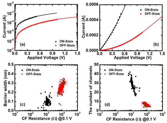Figure 5. The quantum points contact (QPC) model applied to Pt/Pt:SiOx/Ta memristors. The I–V fitting results together with experimental data of ON and OFF states (a) in log scale and (b) linear scale. (c) The barrier thickness and (d) the number of CF paths versus the initial resistance, respectively. The averaged values are: < t g a p > = 0.1   nm , < N > = 30 in the ON-state; and < t g a p > = 0.25   nm ,   < N > = 5 in the OFF-state.