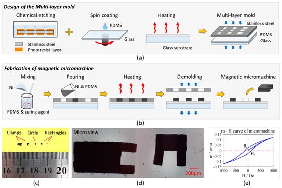 (a) Design of the multi-layer mold. Through-hole patterns were etched on the stainless steel template. It was matched with the glass substrate coated a polydimethylsiloxane (PDMS) layer to form a multi-layer mold. (b) Fabrication of magnetic micromachines. Nickel nanoparticles were mixed with PDMS and poured into the mold. After heating and demolding, the magnetic micromachine peeled off. (c) Macro view of micromachines. Apart from the clamp shape, circles and rectangles were designed, ranging from 2000 μm × 1000 μm × 300 μm to 300 μm × 300 μm × 300 μm. (d) Micro view of micromachines with the clamp shape. (e) Hysteresis (magnetic moment-external field) of a micromachine measured by vibrating sample magnetometer (VSM).