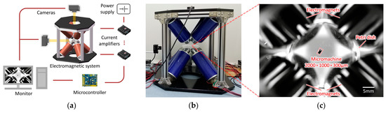 (a) Schematic of the external electromagnetic system. (b) Photograph of the eight-coil system. (c) Image of the micromachine in the workspace from the top camera.