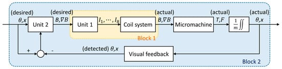 Based on the above concept, the motion control of magnetic actuation was modeled. The modeling of the whole system is shown in Figure 4. Unit 1 calculates all currents of the coil system to generate the target magnetic field distribution. For a good dynamic response, the equivalent value of Block 1 was close to one, so Unit 1 was designed based on the pseudoinverse matrix of the coil system. Unit 2 decides the required magnetic field distribution, which directly determines the final position and direction of the micromachine (discussed in Section 3.2). Therefore, the design of Unit 2 was mainly based on the target position and direction, while their deviations are a supplement. The expected value of Block 2 was also close to one, but it usually took a few seconds for a dynamic response.