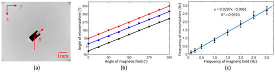 As shown in Figure 6b, the result indicates that the included angle between the micromachine and the magnetic field was constant. As mentioned above, it was essential that the magnetic moment was always in the same direction as the magnetic field. Since the magnetic field was no more than the coercivity, the magnetic moment of every micromachine was almost unchanged during the experiment. Therefore, the magnetized angle of micromachines can be speculated in this way. It is noted that even if a constant magnetic field was input, the micromachine gradually moved to the edge of workspace due to imperfect uniformity. This could be avoided by reducing or removing the magnetic field in time. A better approach is to perform closed-loop control based on visual feedback.