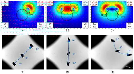 For the micromachine’s position in a steady state, three cases were analyzed to conclude the general principle of position control. In the first case, only one group of up and bottom coils was working. Two groups were given opposite currents in the second case, while they were given the same currents in the third case. The simulations and trajectories are shown in Figure 7. As mentioned in Section 3.2, the micromachine moved toward the maximum magnetic field, meanwhile, its moment was parallel to the magnetic field. In the first case, there was no doubt that the micromachine moved toward the activated coils. In the second and third cases, the same number of coils were enabled. However, the micromachine moved toward the activated coils in the second case but backward in the third case. In Figure 7b, the red region in the workspace acted like a potential well and attracts the micromachine to the maximum. In Figure 7c, the blue region in the workspace acted like a potential barrier and pushed the micromachine to the left or right maximum. In the first and second case, the included angle between the micromachine and the magnetic field was different. In a subsequent experiment, the currents were configured based on the second case to generate an attractive force. Sometimes, the first case was applied to move sideways.