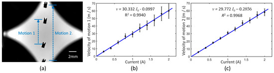 (a) Schematic of velocity measurement. (b) Average velocity of motion 1 actuated by coils. (c) Average velocity of motion 2 actuated by coils.