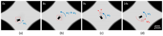 During the manipulation, the micromodules might adhere to the micromachine, which hinders the release of micromodules. One approach is to ensure the micromachine’s groove is aligned with the micromodule, which forms a laminar flow between them to avoid adhesion. Nevertheless, the position control is not always perfect and a small deviation will cause adhesion. Therefore, a throwing strategy (shown in Figure 10) was considered to release micromodules. At first, a low-frequency rotational magnetic field was given to make the micromachine and the micromodule rotate together. In this process, an appropriate angle was considered for release. Then, the field frequency increased suddenly and the micromodule was thrown out along the tangent line. Due to the drag force, the separated micromodule was supposed to stop in a short time. In practice, it’s observed that the released micromodule moves with the vortex flow generated by the high-velocity rotation of the micromachine. It’s a good choice to adjust the micromodule’s position by the vortex. The results show a good success rate to release the micromodules with a high positioning accuracy.