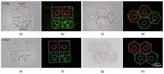 Co-culture of HepG2 and NIH/3T3 cells in micromodules; (a,c) Bright field images. (b,d) Fluorescence images. (e–h) Images after 2-day culture. HepG2 cells were labeled by a red fluorescent reagent and NIH/3T3 cells were labeled by a green fluorescent reagent. The contours of micromodules are marked by white dash lines.
