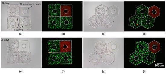 Images of red fluorescence beads and NIH/3T3 cells in micromodules; (a,c) Bright field images. (b,d) Fluorescence images. (e–h) Images after 2-day culture. The contours of micromodules are marked by white dash lines.