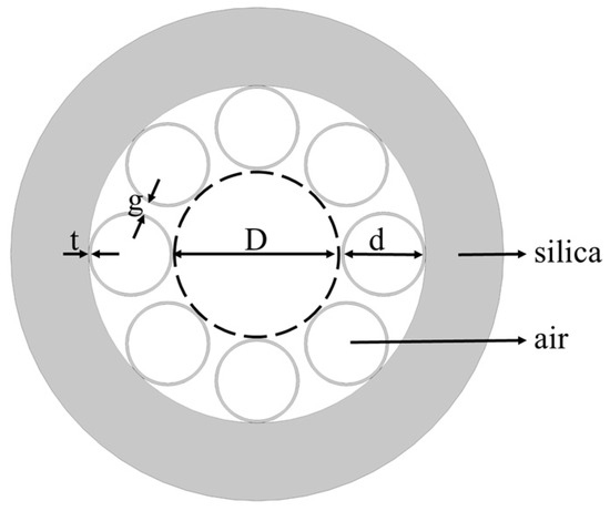 Here, a simple HC-ARF structure consisting of a hollow-core surrounded by eight identical silica tubes (Figure 1) is used to investigate the modal characteristics. The core diameter of D, the inner tube diameter of d, the tube thickness of t, and the tube gap of g are related by the expression D = (d + 2t + g)/sin(π/8) − (d + 2t) [42]. Modal characteristics are calculated using a full-vector finite element method (FEM) with the initial parameters of D of 41 μm, t of 0.394 μm, g of 3 μm, and d of 19.769 μm. The white region represents the air with the refractive index of 1. The gray region represents the background material of silica. The dispersion of silica can be calculated using the Sellmeier equation [43] as follows: