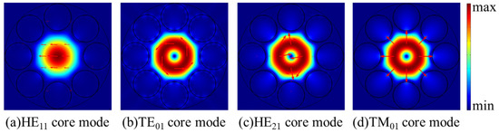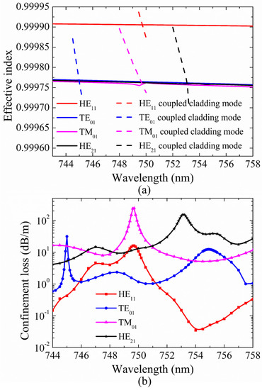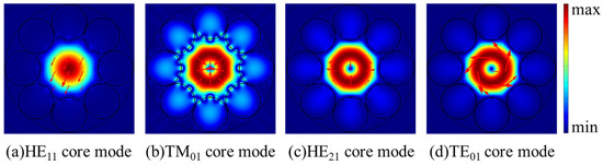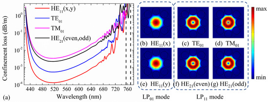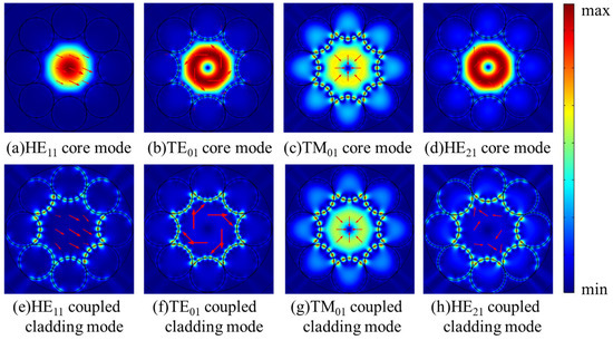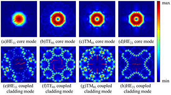 As shown in Figure 3a, the intersection points between the dispersion curves of HE11, TE01, and TM01 core modes and those of related coupled cladding modes correspond to phase matching conditions, leading to high loss peaks of HE11, TE01, and TM01 core modes around 764 nm. It should be noted that, although the dispersion curves of TE01 and TM01 coupled cladding modes cross with that of the HE21 mode around 764 nm, the loss of HE21 mode is kept with the low value without resonant coupling due to the mismatched polarization directions. Furthermore, the electric field distributions in Figure 4a–g show that the HE11, TE01, and TM01 core modes can couple with related cladding modes with matched polarization directions at 764 nm, while the HE21 mode can be well confined in the core due to the mismatched polarization directions at 764 nm. In other words, the high loss peaks of HE11, TE01, and TM01 core modes around 764 nm arise from the resonance coupling between core modes and related cladding modes as the effective index and polarization matching conditions are simultaneously satisfied.