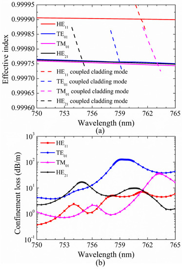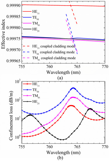 As shown in Figure 2a, the confinement losses of second-order modes are much larger than those of the fundamental modes at the center part of transmission band. However, the results are quite different at the red side of the transmission window. As the wavelength is larger than 670 nm, the losses of HE11, TE01, TM01, and HE21 modes all fluctuate with the wavelength, which can be explained by the fact that the core modes couple to cladding modes localized in silica tubes [45]. The similar loss fluctuations at the red side of the second transmission band are also observed in the HC-ARF with seven tubes [45]. Although the losses of the different modes increase with fluctuations at the red side of the band, the loss of the fundamental mode is always lower than those of HOMs due to the strong coupling between HOMs and tube modes with optimized d/D of 0.7 [45]. However, some interesting phenomena occur in our simulation, which are quite different from the results in reference [45]. For example, the HE21 mode is well guided with the lowest confinement loss of 0.72 dB/m at 762.5 nm, and the losses of the fundamental mode and other HOMs are much higher at this wavelength. The modal properties within the wavelength range from 755 nm to 770 nm, marked with dashed line in Figure 2a, are further investigated in detail in Section 3.1. The cladding modes are affected by the tube structure parameters, which can be optimized to produce the desirable coupled cladding modes. Thus, they will have mode resonance with unwanted core modes, filtering specific core modes even it is a fundamental mode. Through the proposed modal engineering, only second-order vector mode operation can be implemented.