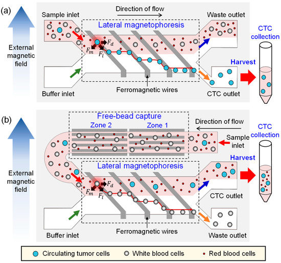 Schematic of (a) the PosCTC-μChip, which contains a lateral magnetophoretic microchannel where circulating tumor cells (CTCs) labeled with anti-EpCAM magnetic nanobeads are isolated by lateral magnetophoresis; and (b) the NegCTC-μChip, which has a free-bead capture microchannel for removing free magnetic nanobeads and a lateral magnetophoretic microchannel for depleting white blood cells (WBCs) tagged with anti-CD45/CD66b magnetic nanobeads.