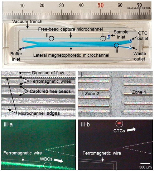 Photographs of the NegCTC-μChip, which consists of free-bead capture and lateral magnetophoretic microchannels. Enlarged views of (i) residual magnetic nanobeads captured on the ferromagnetic wires and (ii) zones 1 and 2 in the free-bead capture microchannel. In the lateral magnetophoretic microchannel, (iii-a) WBCs (green) bound to magnetic nanobeads are forced laterally into the waste outlet, and (iii-b) spiked cancer cells (red) flow into the CTC outlet.