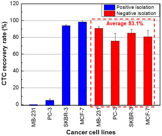 Circulating tumor cells (CTCs) are an important biomarker for the diagnosis, prognosis, and treatment of cancer [1,2,3]. Despite their clinical importance, there is no standard method for isolating CTCs [4] due to their extreme rarity, typically 1–100 CTCs per 1 mL of peripheral blood [5,6]. Therefore, novel methods for isolating CTCs are required, e.g., the CellSearch system (Menarini Silicon Biosystems), the gold-standard CTC isolation system that was the first to be approved by the United States Food and Drug Administration. Most label-dependent positive isolation methods are dependent on the epithelial cell adhesion molecule (EpCAM; epithelial-specific surface marker) on CTCs [7,8]. Because EpCAM-based positive isolation methods are based on immunoaffinity, they have high selectivity and specificity for isolating CTCs from blood. However, their specificity decreases if CTCs acquire a mesenchymal-like phenotype (including decreased surface expression of EpCAM) following the epithelial–mesenchymal transition and is low for CTCs derived from non-epithelial origin cancers (e.g., melanoma) [9,10,11]. In addition, CTCs expressing mesenchymal markers are related to a poor prognosis [12,13]. Consequently, current EpCAM-based positive isolation methods are inadequate due to the rarity and heterogeneity of CTCs and may miss important subtypes of CTCs [14,15,16].