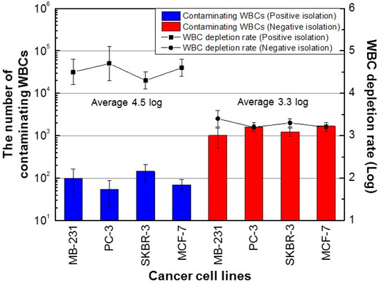 We compared an EpCAM-based positive isolation method and a CD45/CD66b-based negative isolation method, using MDA-MB-231, PC-3, SKBR-3, and MCF-7 cancer cells, which have different surface expression levels of EpCAM. The recovery rates of the positive isolation method increased with increasing EpCAM expression level. In contrast, the negative method enabled isolation of cancer cells from blood samples with an average recovery rate of 83.1%, irrespective of the expression level of EpCAM. Therefore, the negative isolation method yielded a larger quantity of CTCs from blood samples than the positive method, irrespective of their EpCAM expression level. WBCs were also extracted from the blood samples using the positive and negative isolation methods. In the case of the positive isolation method (mean, 92 WBCs per 500 µL of blood), this may have been due to non-specific binding of WBCs to anti-EpCAM magnetic nanobeads. In the case of the negative isolation method, the contaminating WBCs (mean 1379; 10-fold increase compared to the positive isolation method) were those not bound to anti-CD45/CD66b magnetic nanobeads, due to their abnormally low expression of CD45 and CD66b. Of note, the number of contaminating WBCs was similar in both the positive and negative isolation methods (Figure 4). The results of CTC recovery rate and WBC depletion rate are in line with studies reported by the Toner group [17], although they did not use the same cancer cells for positive and negative isolation.