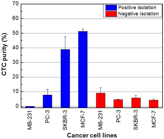 We calculated the purity of the CTCs isolated using the PosCTC-μChip and the NegCTC-μChip as the ratio of the number of CTCs to the sum of the number of CTCs and WBCs (Equation (3)). Using the positive method, the purities of SKBR-3 and MCF-7 cells (high EpCAM expression) were 38.9 ± 8.7% and 51.3 ± 1.6%, respectively (Figure 5). In contrast, the purities of MDA-MB-231 and PC-3 cells were 0% and 7.7 ± 3.9%, likely due to their low expression level of EpCAM. CTC purities of the positive isolation method showed large variations, because the number of contaminating WBCs showed a significant variation, despite being 10 times lower than that of the negative isolation method. Using the negative method, the purities of MDA-MB-231, PC-3, SKBR-3, and MCF-7 cells were 9.0 ± 3.8%, 4.6 ± 0.2%, 5.7 ± 1.7%, and 4.2 ± 0.4%, respectively. Despite the high recovery rate, the purity of CTCs isolated using the NegCTC-μChip was insufficient, due to the number of contaminating WBCs.