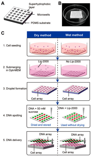 Reverse transfection [6,7,8] has been developed for gene delivery in a high throughput manner, where genetic materials are fixed on glass slides to form the transfection islands. Cells are then seeded onto these islands to uptake the genetic materials. Reverse transfection offers the advantages of high throughput and low reagent consumption. However, several intrinsic limitations are associated with this technique, including the possibility of neighboring effects or cross contamination [9] and the inability to perform multiple transfections in a sequential manner which is usually needed to improve the gene delivery efficiencies [10]. Using a similar strategy, reverse transduction has been developed where viruses are fixed on the glass slides to form transduction islands. In addition to the limitations associated with reverse transfection, the viruses have to be prepared before fixing in the conventional culture plates, which is laborious and low throughput [11,12].