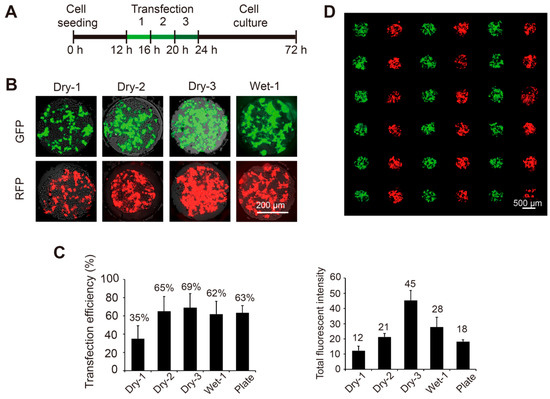 Transfection of plasmids encoding the green and red fluorescent protein (GFP and RFP) genes into 293T cells on the SMAR-chip. (A) Timeline of the on chip transfection (dry method). 293T cells were seeded in the microwells. After a 12-h recovery, one to three rounds of transfections were conducted consecutively, followed by two days of culture. (B) Typical fluorescent images of the cells transfected with GFP and RFP (upper panel) using the dry method for one (Dry-1), two (Dry-2), and three (Dry-3) rounds or using the wet method for one round (Wet-1). (C) Left panel: the transfection efficiencies (left panel) which are calculated as the number of cells with detectable fluorescent signal over the total number of cells in the microwells. Right panel: the total fluorescent signal from the transfected cells data are represented as the mean + standard deviation (n = 20). (D) Merged fluorescent image of 293T cells transfected with GFP and RFP, indicating efficient transfection without cross contamination.