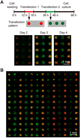 293T cells were seeded at a density of ~80 cells/well. After overnight culture, cells in the microwells reached 70–80% confluency. The normal culture medium was aspirated, and the chip was submerged in Opti-MEM with (dry method, see Figure 1C) or without (wet method, see Figure 1C) 0.5% Lipofectamine® 2000 (Invitrogen) for 10 min. Then, the medium was aspirated, and the chip was swept with a cell spreader to form a uniform droplet array. Plasmid solutions (16 μg/mL DNA and 50 mM sucrose in ddH2O for the dry method, 16 μg/mL DNA and 1% lipofectamin in Opti-MEM for the wet method) encoding green (pll 3.7, Addgene) or red (constructed by replacing the GFP sequence in pll 3.7 with an RFP sequence) fluorescent protein were spotted on a glass slide in a desired format using a microarray spotter (PersonalArrayer 16, CapitalBio, Beijing, China) that emitted a volume of 30 nL per spot. The glass slide was aligned and sandwiched onto the microwell array with the aid of a custom-made aligner. Then, 4–6 h after the addition of plasmids, the transfection was stopped by submerging the chip in normal culture medium. For multiple-round transfections, three rounds of transfections, each of which lasted 4 h, were consecutively performed without interruption. The images of the transfected cells were acquired 48 h after the last round. For sequential transfections, the two rounds of transfections were performed on day 1 and 2, respectively, with an 18-h interval in between.