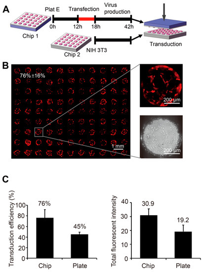 Although the chemical transfection is easy to conduct, its efficiency is low for most of the primary cells [21]. Exploiting the viral infection pathway, the method of viral transduction is efficient for most of the cell types [22] and has been widely used in studies of stem cells and primary cells. Typical virus transduction includes two steps: (1) virus packaging by the packaging cells, and (2) transduction of the target cells by adding the virus containing medium. These two steps can all be performed on the SMAR-chip in a high throughput manner as illustrated in Figure 4A. The retroviral packaging cells Plat-E were seeded on the SMAR-chip and transfected with the viral vector encoding RFP as described above. In the following 48 h, viruses were released into the droplets in each microwell. To infect the target cells, the chip with the viruses was upside-down aligned and sandwiched with the chip seeded with NIH-3T3 cells, which showed very low transfection efficiencies (22% using Lipofectamine® 2000) in published data [23,24]. As shown in Figure 4B, the expression of RFP was observed in 76% ± 16% of the NIH-3T3 cells, demonstrating successful virus packaging and transduction.