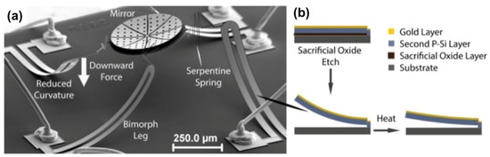 Pictures of a microelectromechanical systems (MEMS) micromirror using electrothermal actuation: (a) Scanning electron microscope (SEM) image of the micromirror device; (b) Illustration of bimorph layers before and after oxide etch and reduced curvature due to heating. (Reproduced with permission [24], Copyright 2015, Optical Society of America).