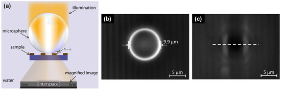 Microsphere lens used for super-resolution imaging: (a) A microsphere is positioned on a grating structure and illuminated from the front, the light reflected by the grating allows detecting a magnified image. When the distance h between the microsphere and the grating is small enough (of order of the illumination wavelength λ), the near-field evanescent wave carrying the fine details of the grating can become propagating in the high refractive index sphere, and later in the medium where it is to be collected by the microscope objective; (b,c) Optical microscopy images obtained by positioning a 9.9 μm microsphere on the grating. The image of (b) is focused on the microsphere’s center plane, and the corresponding image (c) is focused on the image plane. (Reproduced with permission [35], Copyright 2016, American Chemical Society).