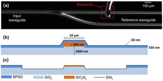 Fabrication procedure of silicon oxynitride waveguides: (a) Optical image of the top view of the waveguide; (b,c) Schematic cross-sections of the waveguide structure before (b) and at the bioreactor well (c). (Reproduced with permission [38], Copyright 2014, Institute of Physics).