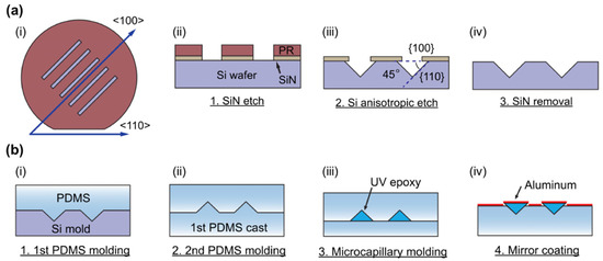 Micromirror fabrication process: (a) Line patterns with 45° alignment to (110) wafer flat were formed on a SiN wafer. Anisotropic Si etch leads to cross-section of right angle isosceles triangle. RIE etch of remaining SiN gives final Si master mold; (b) Polydimethylsiloxane (PDMS) microchannels were made by two step replica molding from the Si master mold. UV curable photopolymer was filled and cured in the micro- channels. The released structure was coated with aluminum using sputtering. (Reproduced with permission [48], Copyright 2014, American Institute of Physics).