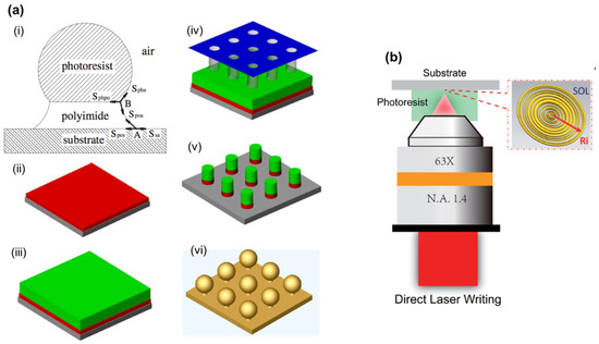Fabrication methods for microlenses: (a) Illustration of a micro-ball lens formation in the thermal reflow process. A polyimide layer is coated on a Si wafer beneath a photoresist layer. Photolithography process is used to pattern these two materials through a mask. Micro-ball lens array with a pedestal can be generated after heat reflow; (b) Schematic diagrams of direct laser writing to form a super-oscillatory lens. ((a) Reproduced with permission [49], Copyright 2004, Institute of Physics; (b) Reproduced with permission [51], Copyright 2018, Royal Society of Chemistry).