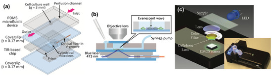 Microsystems used for in vitro imaging: (a) Schematic of a microdevice that is equipped with an optical fiber, a microlens and a micro-prism; (b) The integrated device for in situ observation and analysis of cells; (c) Schematic of an optofluidic device used for fluorescent imaging cytometry on a cellphone, the insert is a picture of the setup. ((a,b) Reproduced with permission [58], Copyright 2012, Springer; (c) Reproduced with permission [65], Copyright 2011, American Chemical Society).