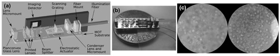 A microendoscope used for in vivo imaging: (a) Optical components mounted on the substrate; (b) The integrated device shown above a United States penny for scale; (c) Widefield image of cells labeled with gold nanoparticles, the image taken with the microendoscope is on the right, and a similar image taken with a Zeiss Axiovert 100 M is shown on the left for comparison. (Reproduced with permission [72], Copyright 2008, Society of Photo-Optical Instrumentation Engineers).