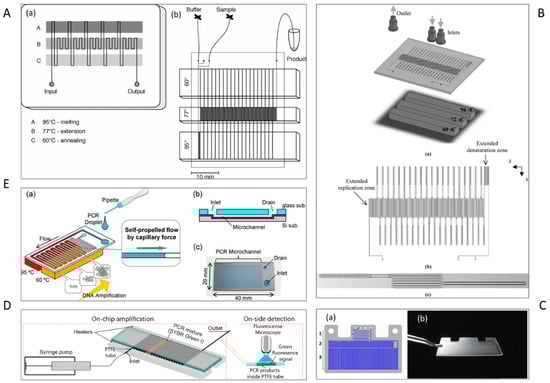 Dynamic PCR devices. (A) (a) Schematic illustration of a chip for flow-through PCR. Three temperature zones are stabilized at 95 °C, 77 °C, and 60 °C using thermostated copper blocks. The sample is pumped into a single channel etched in the glass chip. (b) Layout of the microfluidic device. The device has three inlets for carrying the sample/buffer and one outlet [27]. (B) (a) A schematic representation of the thermally-optimized 20-cycle continuous-flow PCR microfluidic device. (b) A top view of the microchip. (c) One cycle of the microchannel with different widths [47]. (C) (a) Schematic presentation of the chip. (1) Mixing zone. (2) Polymerase activation zone. (3) Thermal cycling zone. (b) Image of the chip [6]. (D) A schematic of on-chip amplification and on-site detection of amplicons using a GPG microdevice [52]. (E) Schematic illustration of a device for self-propelled continuous-flow PCR: (a) concept diagram, (b) cross-sectional view of device, and (c) picture of device [58]. Reproduced from the mentioned references with permission from the related journals.