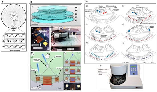 (A) Microfluidic design of a compact disc (CD) device and schematic illustration of single cell isolation: (1) a large number of microchambers align along a channel, (2) the cells flow through the microchambers and (3) are spread into individual microchambers [69]. (B) (a) Schematic graph of the multi-layered centrifugal disc. The disc is comprised of five layers of hard plastic: A. polycarbonate sheet, B. pressure sensitive adhesive tape (PSA), C. polycarbonate sheet, D. polycarbonate film, and E. polycarbonate film. (b) (Right) Image of the integrated centrifugal microfluidic platform for pumping, valving, and thermocycling of fluid. (Left) Close-up of the actuated thermal platform showing the location of the central thermocycling TE and two ice-valve TEs. (c) Schematic presentation of the hardware details and fluidic process for the integrated CD system [70]. (C) Schematic illustration of one microfluidic structure: (a) elution buffer and PCR mastermix are loaded to the inlets, (b) the elution buffer is transported into two elution buffer chambers while the PCR mastermix is distributed into metering fingers, (c) the PCR mastermix aliquots are gated into amplification chambers which filled with primers, (d) DNA is added to one of the sub-volumes, (e) each subvolume is aliquoted into several aliquots, (f) PCR is started, and (g) the Lab Disk is mounted to a custom-made holder [71]. Reproduced from the mentioned references with permission from the related journals.