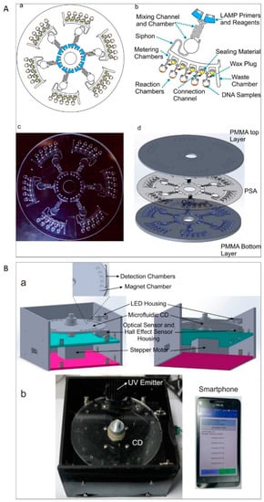 (A) (a) Schematic depiction of the centrifugal LAMP microdevice. (b) Top view of one unit of the microdevice. (c) Digital picture of the microdevice. (d) Schematic illustration of the microdevice consisting of PMMA and PSA. (B) (a) Three-dimensional (3D) model of the endpoint detection system. (b) Image of the endpoint detection platform with the application software running on a smartphone [65]. Reproduced from the mentioned reference with permission from the related journal.