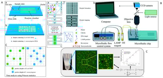RPA provides significant advantages over existing amplification methods such as low incubation temperature, ease of primer design, sensitivity, and high tolerance to impurities in sample [112]. Due to the robustness of its biochemistry, RPA has been integrated into microfluidic devices. Lutz et al. developed a fully automated centrifugal microfluidic cartridge including pre-stored liquid and dry reagents for RPA [113]. The fluidic cartridge can run up to 30 reactions simultaneously in separate 10-mL microchambers. This system was employed for the detection of the antibiotic resistance gene mecA of S. areus. The limit of detection (LOD) was less than 10 copies and the assay time was approximately less than 20 min. Hakenberg et al. designed a phase-guided passive microfluidic batch mixing chip for RPA. The device can be fabricated through an inexpensive approach that integrates dry film resist technology and direct wafer bonding [114]. This detection assay relies on phase-guided fluid handling, resulting in direct fluorescence detection from the chip after a one-minute mixing sequence. RPA has been also used in a droplet microfluidic chip. The microfluidic digital RPA slip-chip has been employed for the simultaneous running of over 1000 nL-scale RPA reactions in parallel [115]. The amplification process starts by adding a chemical initiator to each reaction compartment. During the experiment, precise temperature control is not required owing to RPA tolerance of fluctuations in the incubation temperature ranging from 37 to 42 °C. The generation of an amplified target material is monitored by fluorescence. The performance of this platform was validated by the successful amplification of methicillin-resistant S. aureus genomic DNA. RPA has been growing in popularity in digital microfluidics. Recently, Kalsi et al. [116] performed RPA on a digital microfluidic device using magnetic beads and a pre-concentration unit. The sample with DNA is immobilised on the magnetic beads and then is introduced to a pre-concentration unit that interfaces with the digital microfluidic device. Next, the DNA-loaded beads are pulled through an immiscible oil/aqueous interface directly onto the digital microfluidic platform. The required temperature for amplification is just 39 °C. The final sample volume is 2 μL in a single step and the assay time is less than 30 min with a LOD of 104 bacteria colony forming units (CFU)·mL−1.