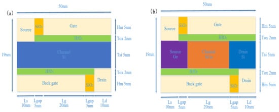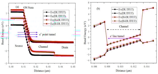 Figure 5a,b respectively show the on-state energy band of DLTFET and H-DLTFET under the different position. It can be observed from Figure 5a that the energy band at the source-channel tunneling junction of H-DLTFET is more curved than that of DLTFET, so it has the narrower tunneling barrier width. The electrons from source region can tunnel to the channel region easily, which is largely dependent on the tunneling barrier width []. Besides, the line tunneling current of DLTFET and H-DLTFET can also be confirmed by the on-state energy band from top channel to bottom channel, as shown in Figure 5b. Since the valence band of the channel bottom can be aligned with the conduction band of the channel top, many electrons from the channel bottom can tunnel to the channel top, thereby forming the tunneling current.