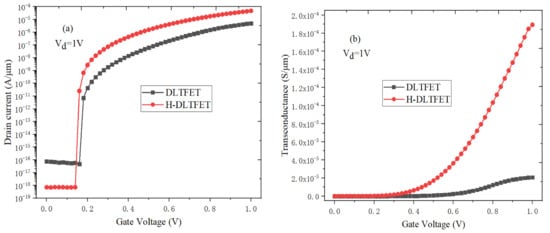 The trans-conductance (gm) is an important characterization parameter of frequency characteristics, which can determine the intrinsic gain of semiconductor devices. Figure 2b shows the gm value of DLTFET and H-DLTFET as a function of gate voltage. The gm can be calculated by the following Equation (1) []: