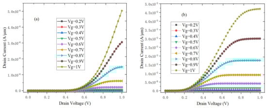 Figure 3a,b respectively show the output characteristics of DLTFET and H-DLTFET under the different gate voltages. The output currents of DLTFET and H-DLTFET can be divided into the exponential growth region and the saturation region. The output current would increase to the saturation value when the drain-source voltage is greater than the saturation pinch-off voltage. At the same time, there is no change in the tunneling barrier width. Besides, the output current would increase when the gate voltage increase. The reason is that the energy band of tunneling junction could be steeper, and the BTBT distance decrease with the gate voltage increases. The maximum output currents of DLTFET and H-DLTFET are respectively 5.03 × 10−6 A/μm and 4.71 × 10−5 A/μm. The output current of H-DLTFET can be increased by an order of magnitude compared with the DLTFET, so the H-DLTFET has the higher saturation output current.