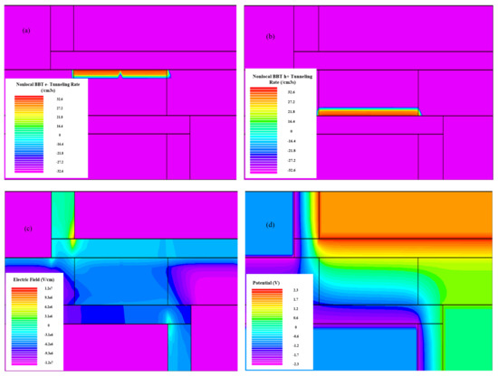 (a) e-BTBT rate; (b) h-BTBT rate; (c) Electric field; and (d) Potential distribution of the H-DLTFET.