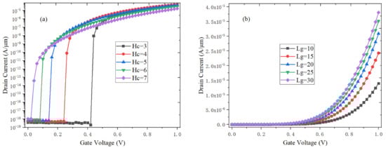 In Figure 6a, the channel electric field coupling effect between gate and back gate is weakened when the channel thickness (Hc) increase. Meanwhile, the electric field, electronic tunneling probability and on-state current of channel are all reduced. Figure 6b shows the effect of channel length (Lg) on the transfer characteristics. The barrier width of the tunneling junction becomes less susceptible to the drain voltage with the Lg increases, the line tunneling area and the electron tunneling number increase, thereby increasing the on-state current of H-DLTFET. However, the on-state current rises slowly and the preparation process becomes complicated when the channel length exceeds 20 nm [,]. It can be concluded that the optimal Hc and Lg are 5 nm and 20 nm, respectively.